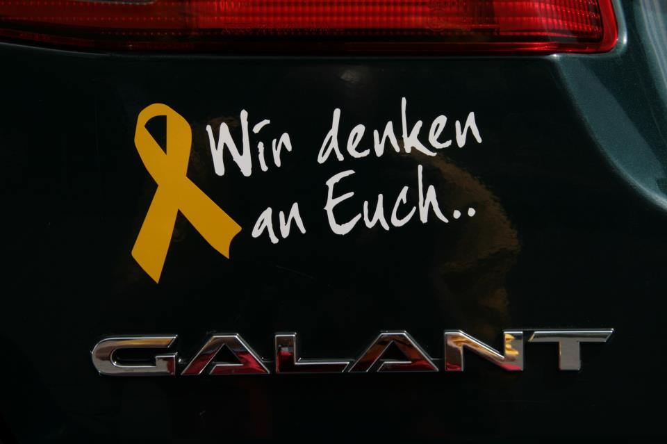 für Solidarität mit SoldatenSolo oder mit Text „Wir denken an Euch…“ oder „Mit unseren Soldaten & ihren Famililen“Unsere Autoaufkleber bestehen aus professioneller KFZ- Beschriftungsfolie, sind also besonders hochwertig in Bezug auf Witterungsbeständigkeit und Haltbarkeit. Die Gelbe-Schleifen-Aufkleber werden auf einer speziellen Transferfolie und mit Anleitung für die Beklebung geliefert.Gelbe Schleife mit Text „Wir denken an Euch...“Gesamtgröße ca. 15,5cm x 7,5 cm Schleife in Größe N(Für individuelle und größere Mengen oder/und andere Größen rufen Sie uns einfach an.)