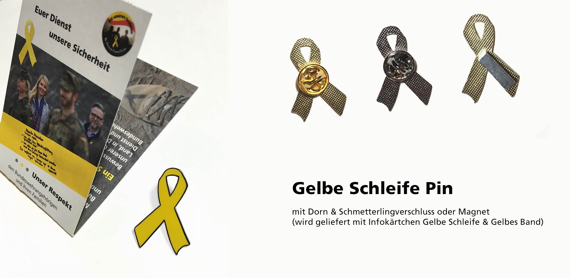 Machen Sie mit und tragen unsere „Gelbe Schleife“ für Solidarität mit unseren Soldaten & ihren Familien. Den Anstecker aus hochwertigem Hartemaille gibt es als Pin (neutral) mit Schmetterlingsverschluss und mit Magnetverschluss.